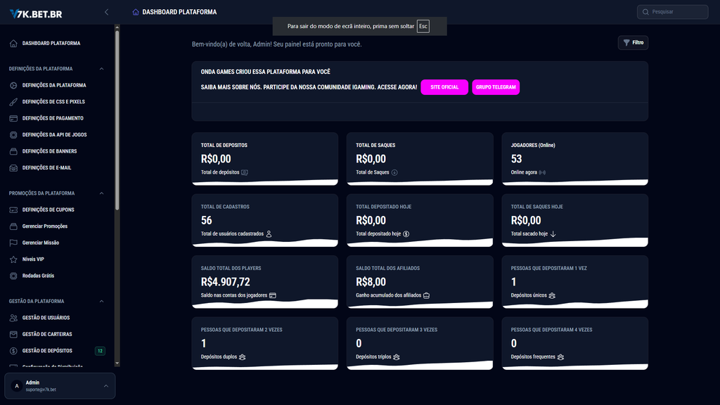 Painel Administrativo Completo ⚙ – Controle total de usuários, finanças, jogos e estatísticas.