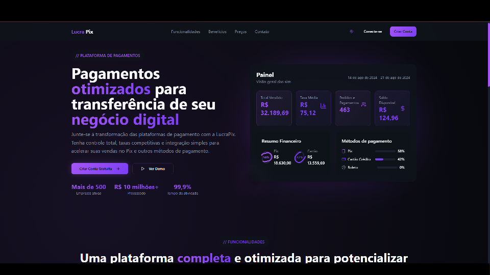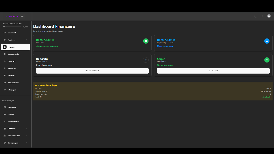 Ideal para quem deseja criar sua própria fintech, processadora de pagamentos, plataforma de recargas, gateway privado ou central de automação financeira, o LucraPix oferece velocidade, segurança e escalabilidade em um único sistema.