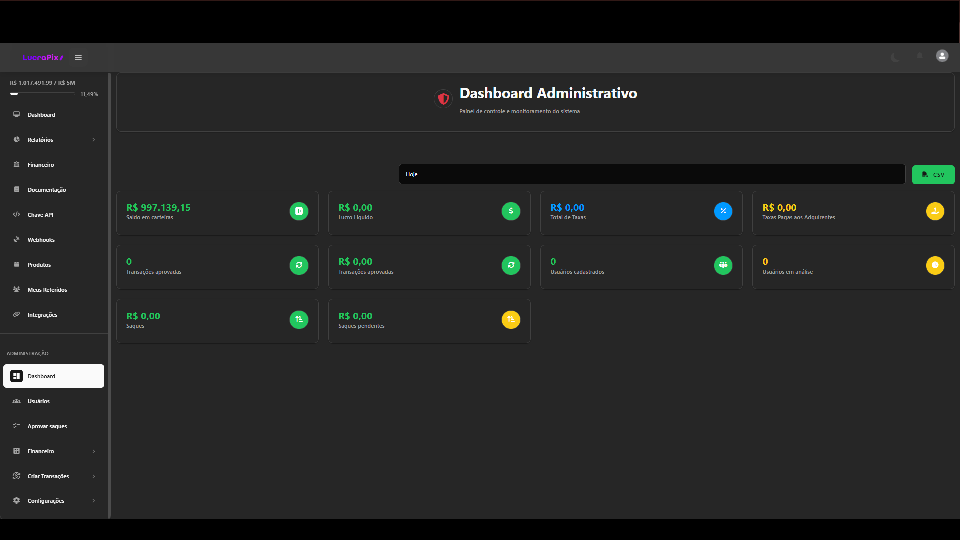 Controle total de usuários, carteiras, saques, logs, taxas e limites em um painel moderno, responsivo e seguro, com gráficos e relatórios detalhados em tempo real.